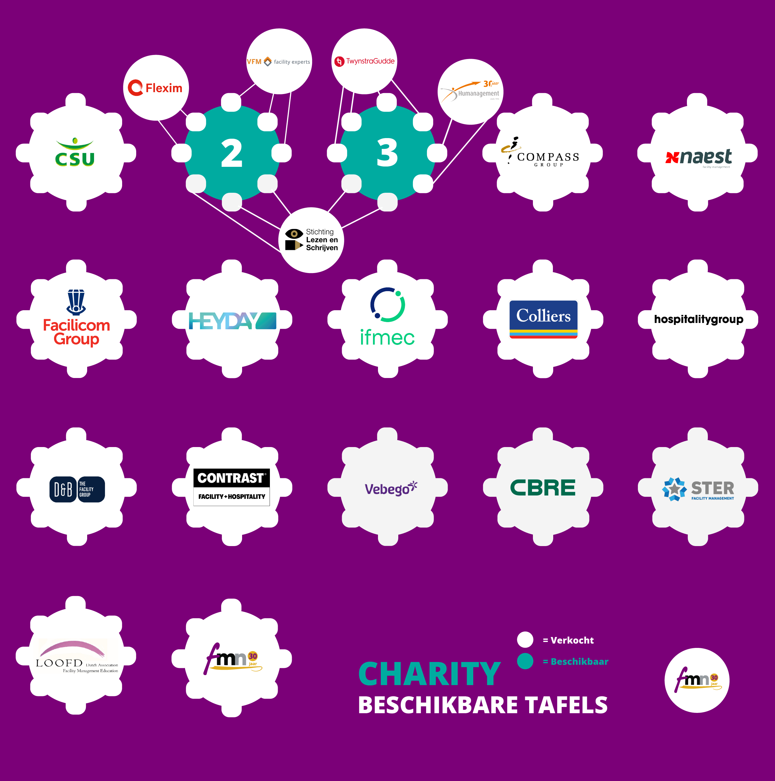 Alle tafels en stoelen voor het FMN Charitydiner op 27 november zijn uitverkocht. Bovenstaande organisaties dragen zo direct bij aan Stichting Lezen & Schrijven!