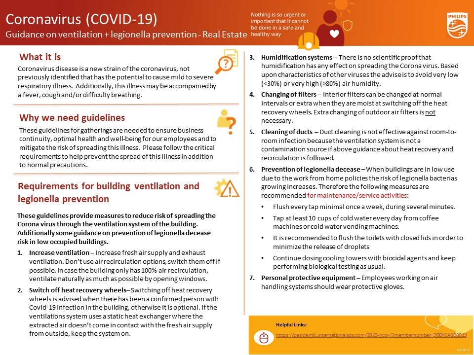 Op basis van diverse bronnen (o.a. Roberto Traversari van TNO die deel uitmaakt van het expertpanel dat ziekenhuizen adviseert over luchtbehandeling tijdens de corona-epidemie) zijn bij Philips bijgaande richtlijnen voor ventilatie en extra legionellabeheersing opgesteld. Het FMN Expertteam Huisvesten heeft deze aanbevelingen vertaald.